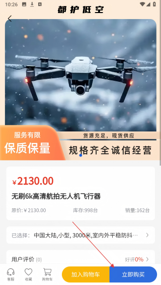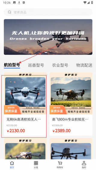 1、在航拍型号分类页面找到心仪的商品卡片,点击进入详情页。