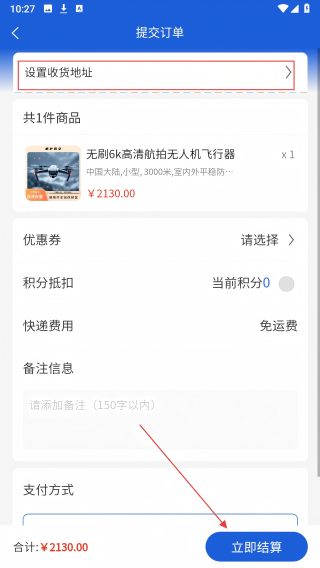 4、在提交订单页设置收货地址,核对金额后点击【立即结算】按钮。